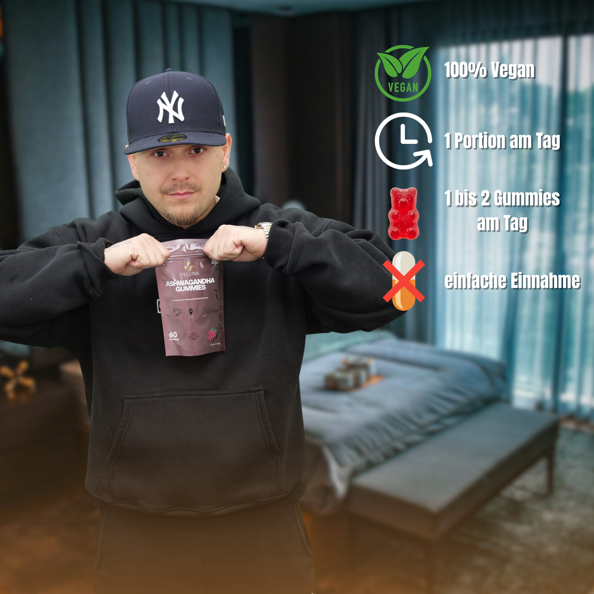 Maltitollösung, Pektin, Wasser, Zitronensäure, Natriumcitrat, pflanzliches Öl, natürliches Himbeeraroma, Pflanzenöl, Carnaubawachs, Ashwagandha-Extrakt