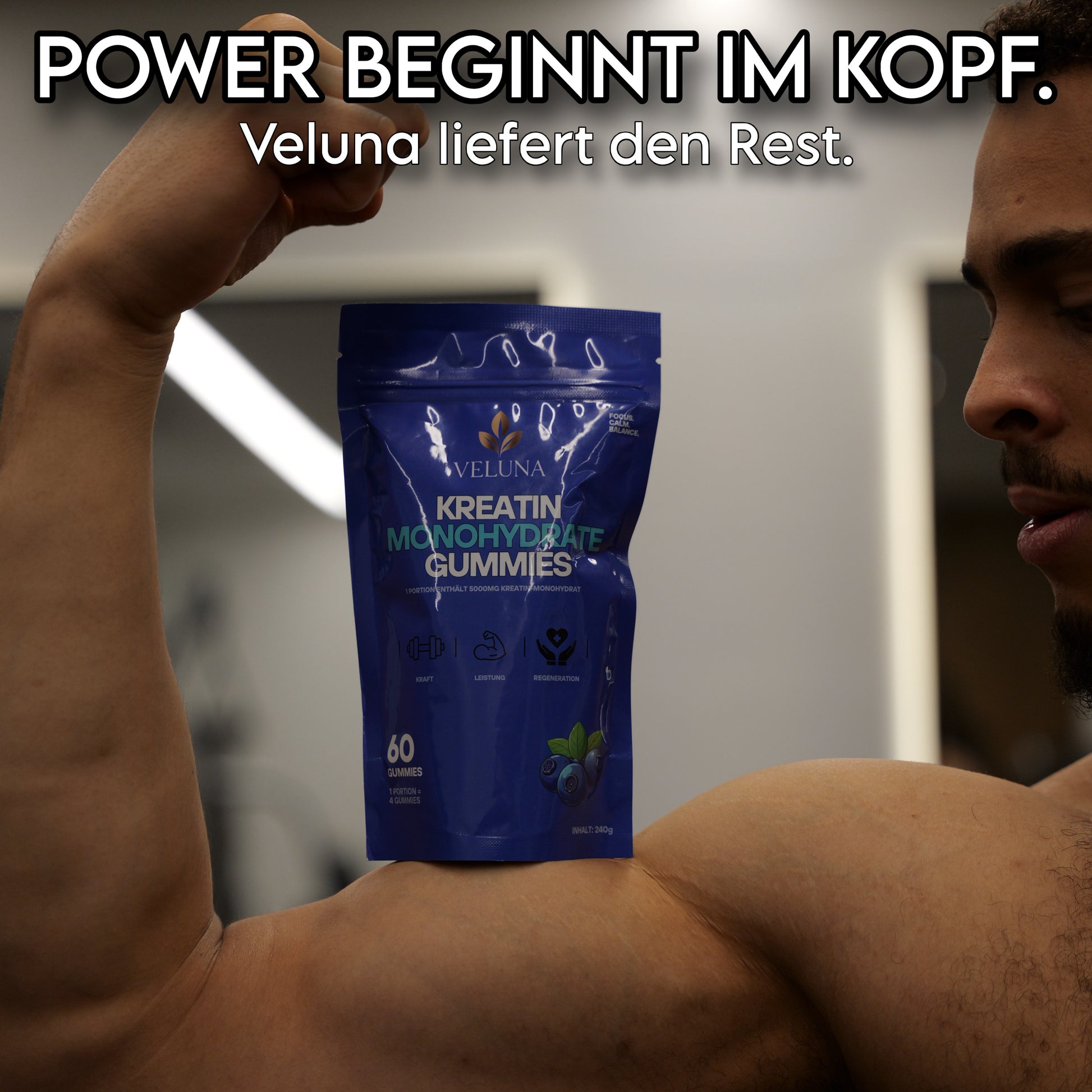 Veluna Kreatin Gummies – 5000mg Kreatin Monohydrate in jedem Gummi.